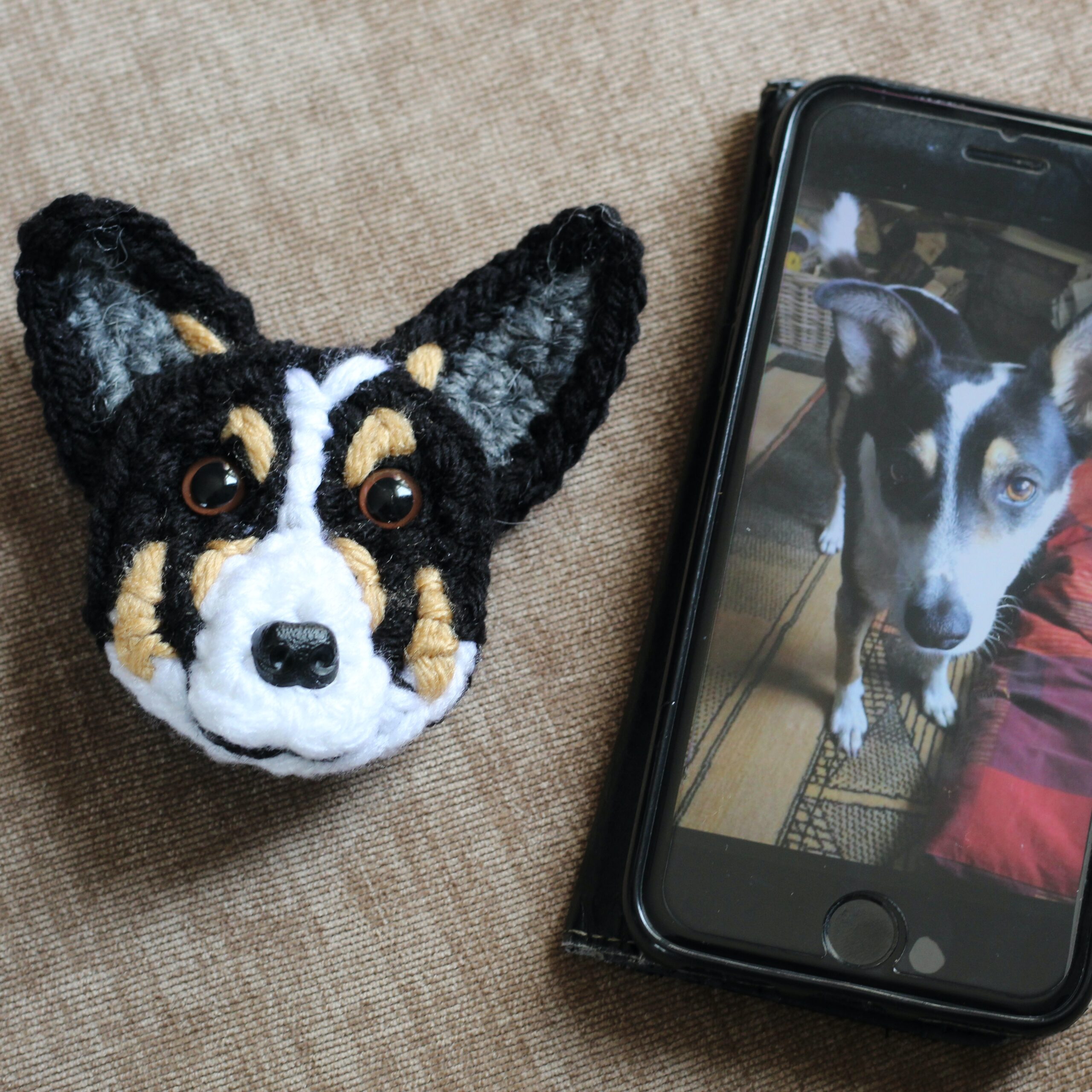 A personalised crocheted face of your pooch, created from your photographs and lovingly attached to a brooch pin.
